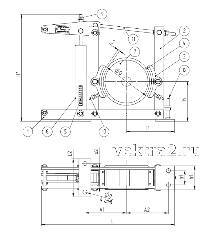 | Тормоз | L, мм | H, мм | D, мм | h, мм | A1, мм | A2, мм | a1, мм | a2, мм | b1, мм | b2, мм | L1, мм | d, мм | s, мм |